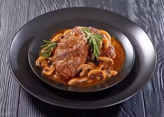 4、將煎好的牛排放在盤子中,倒上蘑菇汁即可食用。