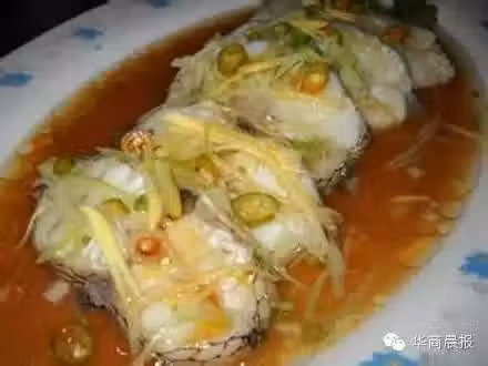 3、將蒸好的鱈魚擺入盤中,撒上薑絲和辣椒碎及香菜末點綴。