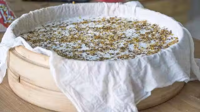 6、繼續舀入糕粉,繼續用刮面刀將表皮刮平,表面撒適量的干桂花,再用邊上的紗布將表面蓋住,生胚就做好了;
