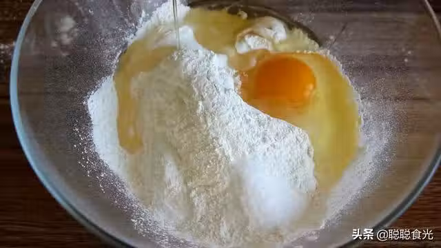 步驟一:把麵粉倒入一個大碗中,在碗的不同位置分別加入小蘇打,無鋁泡打粉,鹽,雞蛋,玉米油,筷子攪勻。