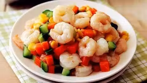 主料:蝦仁350g 黃瓜30g 胡蘿蔔30g