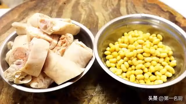 1,準備黃豆,前一天晚上放入盆中浸泡,第二天就可以用了。準備兩隻處理好的豬腳,剁成大塊放入盆中備用。把提前泡好的黃豆撈出備用。