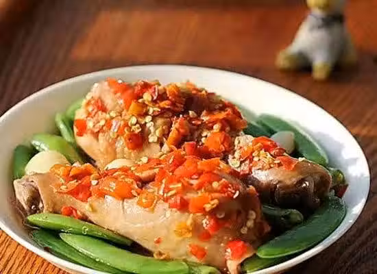 原料:雞腿2個、荷蘭豆1把、剁椒1大把、姜1塊、蒜5瓣、海鮮醬1小勺、生抽1小勺、料酒1小勺、胡椒粉1小勺、食鹽1小勺