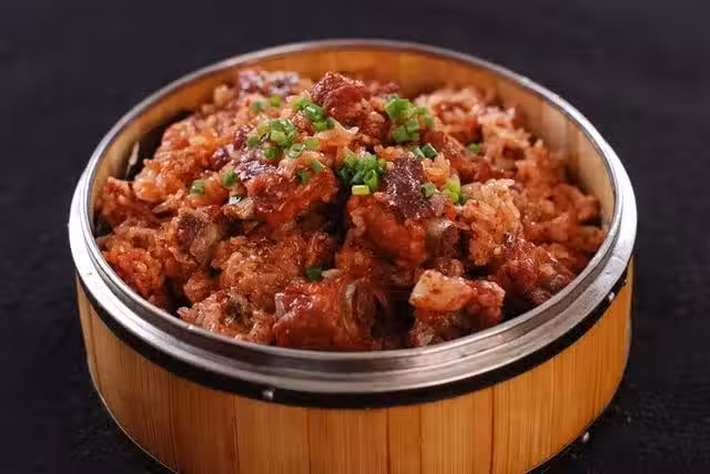 原料:糯米200克、豬小排300克、細香蔥2根、五香粉1/2茶匙、醬油1/2湯匙、蚝油1/2湯匙、料酒1湯匙、植物油1/2湯匙、食鹽1/2茶匙