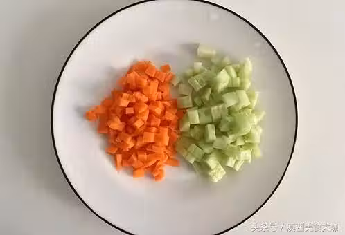 5 、煮蛋期間把黃瓜和胡蘿蔔切小丁~不愛生吃胡蘿蔔的可以焯一下水。