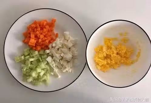 8 、雞蛋煮熟後,蛋白切丁備用,蛋黃趁熱用小勺壓碎