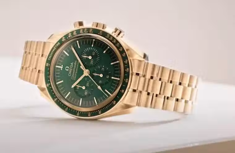 歐米茄先前曾在阿波羅11號50週年時推出過啟用Moonshine™金的登月錶,睽違三年品牌再度將這種獨家的貴金屬材質應用在非限量的登月錶上,讓更多喜歡金黃光澤登月錶的收藏家能擁有豐富的選擇性。廣義來說,Moonshine™金可以被歸在傳統的黃金材質,就像Sedna™金類似玫瑰金、Canopus Gold™金類似白金,不過這些歐米茄獨門的合金畢竟成份經過精心調整,不只是名稱很特別,它們本身的特性也會與傳統貴金屬不太一樣,例如Moonshine™金就比黃金的色調要淡一些,也比較不會因為佩戴時間拉長而顯得光澤黯淡。而2022年綠面的Moonshine™金登月錶還多了個特色在於歐米茄將錶圈換成了陶瓷材質,這點與前一年推出的新版登月錶慣用鋁圈設計有別,屬於一種產品內涵的深度進化。