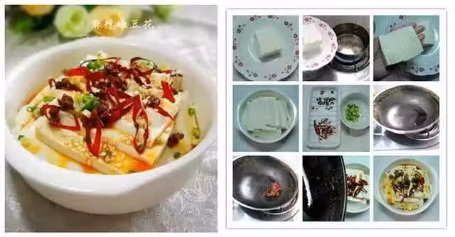 8)煎好的麻辣油一起倒在豆腐上。9)撒上白熟芝麻和蔥花,吃時拌勻。