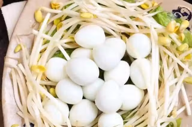 材料:鵪鶉蛋10個、豆芽、薑末、鹽、食用油