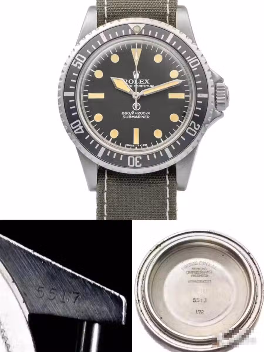 Double Refernce 5513/5517是這三個型號中最稀有的,生產周期在1977到79年,是這三個型號第二出現的,軍用型號序列號3,900,000左右。當年這個型號當年生產總量不超過180個,現在原裝存世的不會超過20個。因為後蓋寫的是5513,表耳處寫的是5517,所以說被稱為Double Refernce 5513/5517。