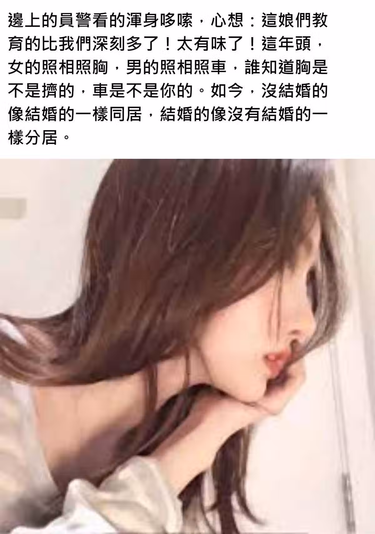 這年頭,女的照相照胸,男的照相照車,誰知道胸是不是擠的,車是不是你的。