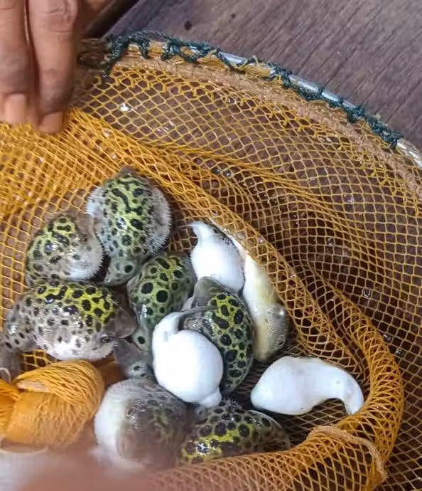 養魚場工作人員以魚網撈起河豚,供旅客觀賞。(黃順光攝)
