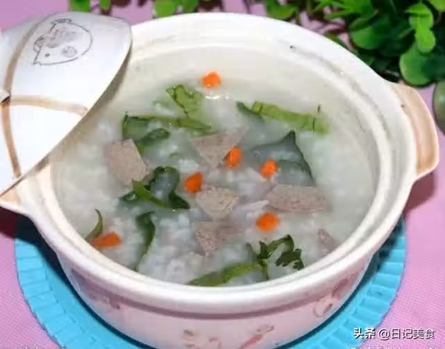 5、米粥煮好後放入切好的豬肝丁將拌均勻,蓋蓋燉煮10分鐘即可