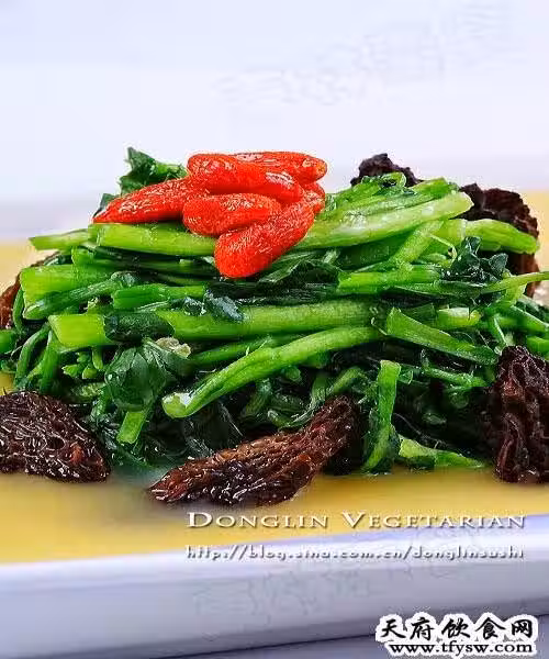 8.在西洋菜旁邊放入步驟2的羊肚菌,西洋菜頂部放幾粒步驟4的枸杞子即可。