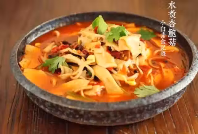 4、鍋燒熱下油,入生薑、八角、花椒、干辣椒小火煸香,接著下入郫縣豆瓣醬炒香,然後倒入估計能沒過菜2/3的水,燒開,下糖,下豆芽煮三四分鐘,然後下入芹菜段和杏鮑菇片攪拌,煮個一二分鐘~ 杏鮑菇片變軟(杏鮑菇很容易熟)即可關火;