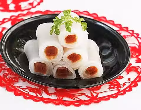 7.將調好的糖醋汁倒在蘿蔔卷上,再淋上糖桂花,腌2小時左右即可生菜辣菇卷