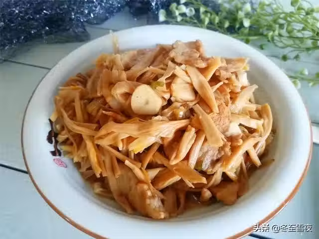 【黃花菜炒肉】所需材料:干黃花菜200克、五花肉150克、油鹽適量、蔥1段、姜1片、大蒜2瓣、料酒1/2湯匙、醬油1湯匙、