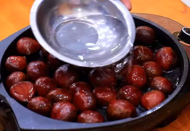 4.時間差不多時,打開鍋蓋看一下水分已經基本收乾了,把蜂蜜水均勻的淋在板栗上面,開小火不停地翻炒讓它均勻受熱,一直翻炒至板栗全部開口,蜂蜜水收干即可,美味即成。