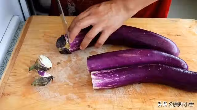 我買了3個長條的新鮮紫皮,總共花了不到2塊錢。茄子洗乾淨後把茄子的根部切掉不要,然後再對半、豎著切開。