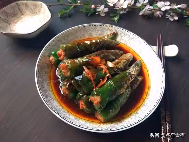 所需材料:尖椒8個、豬肉(肥瘦)250克、 輔料:植物油3湯匙、鹽3克、白鬍椒粉、料酒1湯匙、蔥1段、姜2片、大蒜2瓣、生抽醬油2湯匙、老抽醬油1/2湯匙、