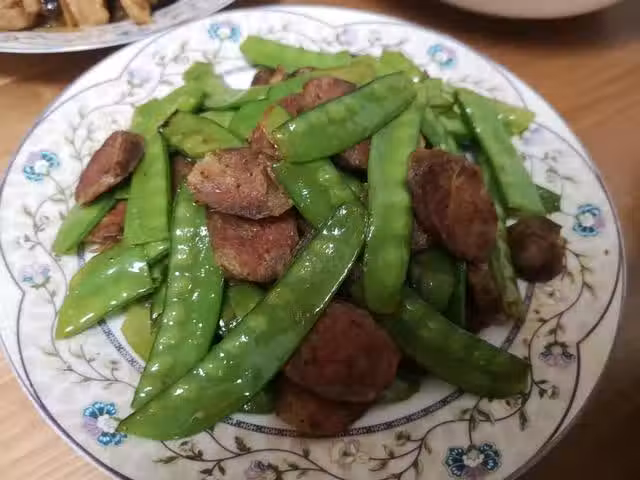 熱鍋涼油,把臘腸片入鍋翻炒煸出香味,再加入荷蘭豆,大火翻炒,迅速炒熟即可出鍋裝盤。如喜歡吃熟一點的可以加少許開水,繼續翻炒一會