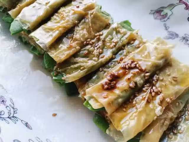 荷蘭豆100克;油豆皮1張;炒熟白芝麻2克;淺色醬油/生抽3克;植物油15克