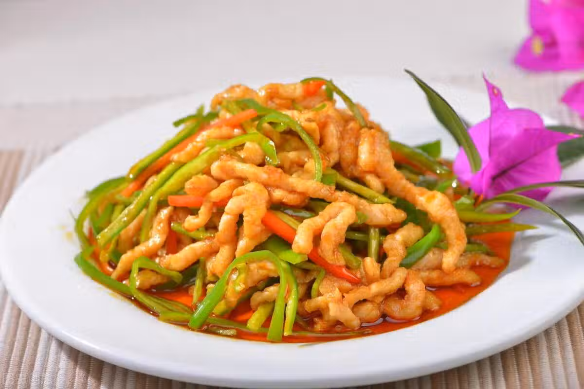 然後還有很關鍵的一點,要低油溫把肉「滑熟」,而且油量要稍微寬一點,以肉絲為例,肉絲下鍋要待到表面基本糊化定型後,用勺子滑散開來,全部變色後就可以盛出待用,然後再去和其他食材同炒才能嫩而不老。