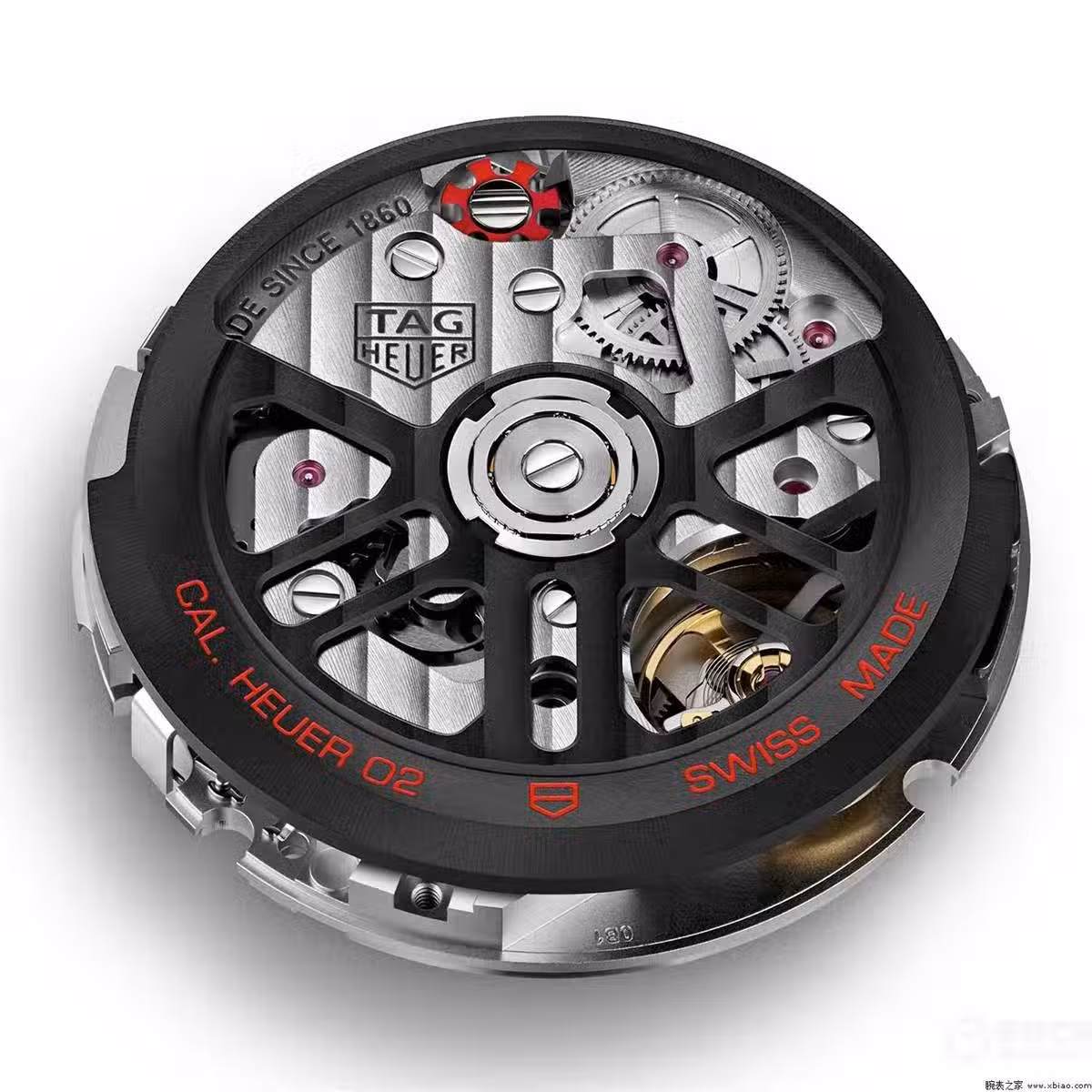 在機芯裝飾上,泰格豪雅一貫是現代風格,自動陀、上層夾板有日內瓦條紋裝飾,下層夾板噴砂,柱狀輪漆成了紅色,自動陀做了鏤空。