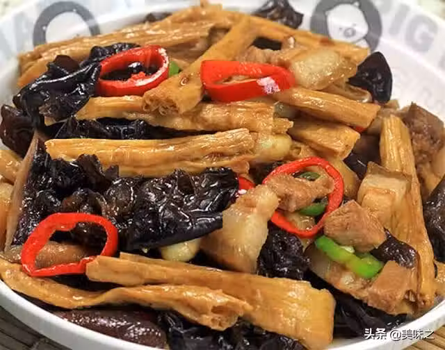 五花肉、木耳、腐竹、青紅椒、蒜頭、鹽、油、生抽。