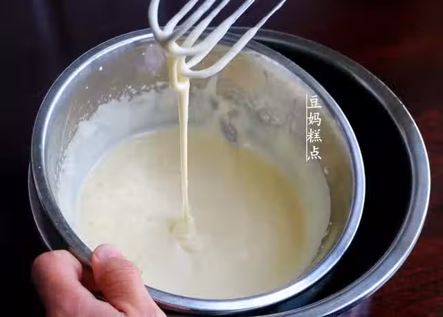 這個時候的麵糊是有一定的粘稠度的,用攪拌片可以直接鏟起,如果是很稀的,那一定是沒有打發到位,或者消泡了。