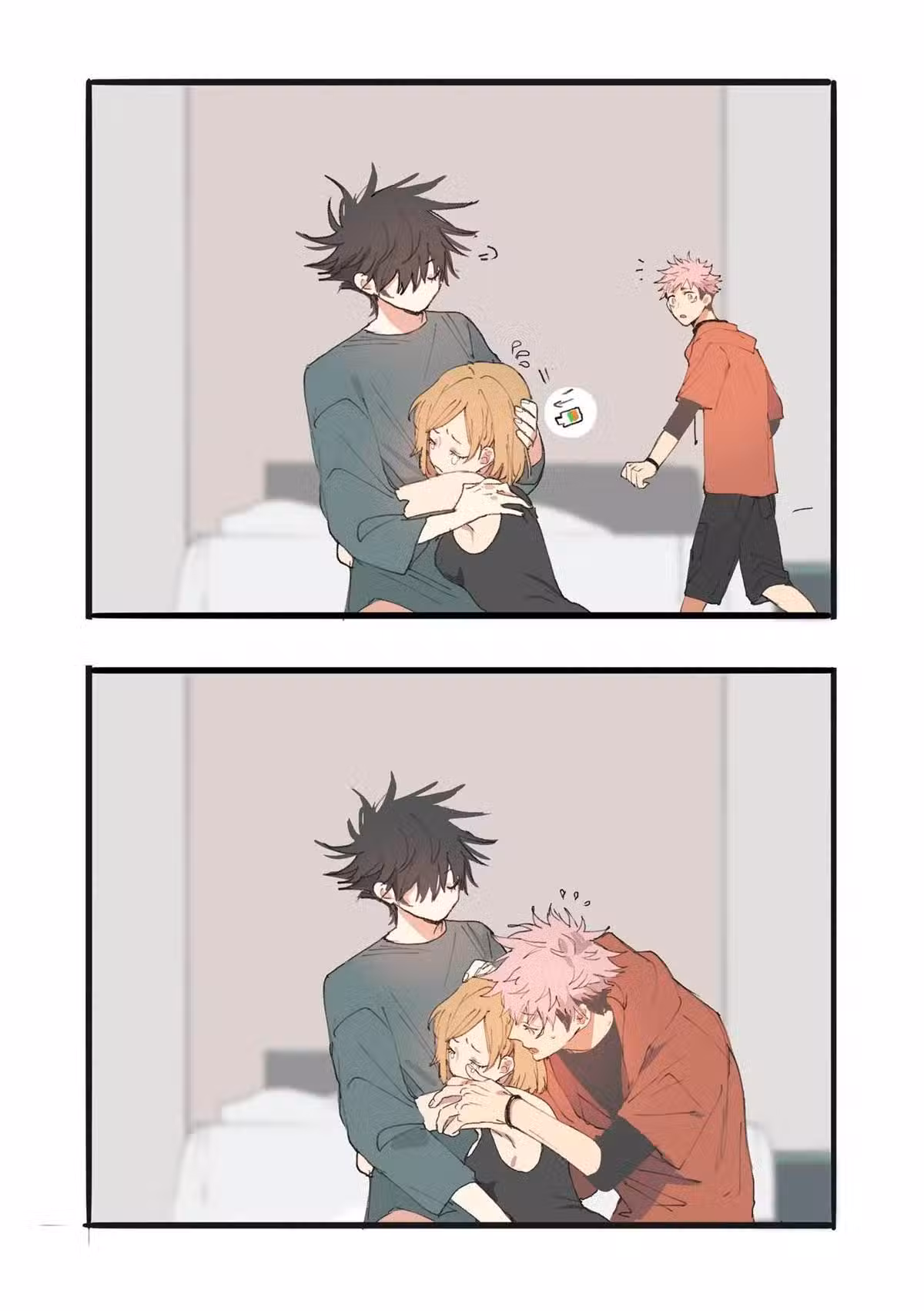 薔薇和伏黑立即抱抱充電。最溫暖的虎杖見伏黑充電太慢,也上前抱了薔薇,希望她能快點走出傷心陰霾。