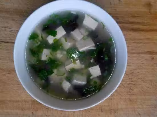 3、將素高湯倒入鍋中燒開,然後加入豆腐丁,煮約4分鐘後再加入木耳,調入適量鹽和調料;