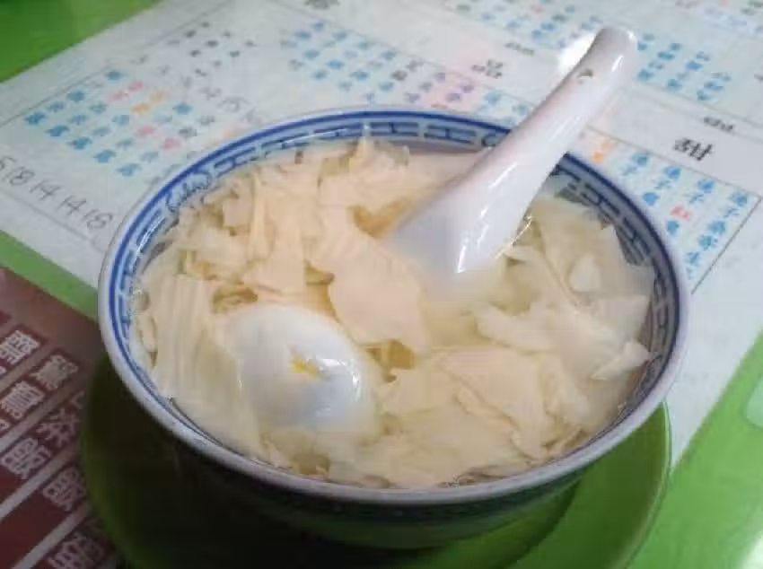 材料:干腐竹10克,雞蛋2隻、冰糖適量、姜一小片