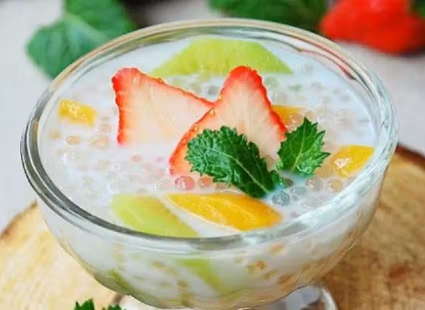 原料: 西米、牛奶(或者椰奶)、水果(草莓、西瓜、蘋果或者你喜歡的水果)。