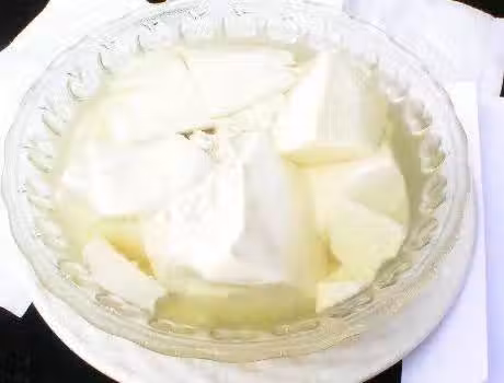 第四步,這個時候便成豆花,喜歡吃豆花的便可盛出享用,做好的豆花倒入在一個事先鋪有細紗布的容器中,加上蓋子,並且在盒子的上面用一個重物壓著,用了差不多一個晚上的時間;