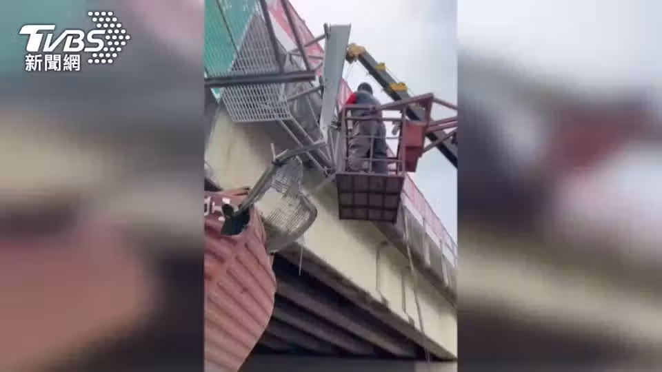 扯!20呎貨櫃突彈起「直立」卡橋墩害 國道塞爆