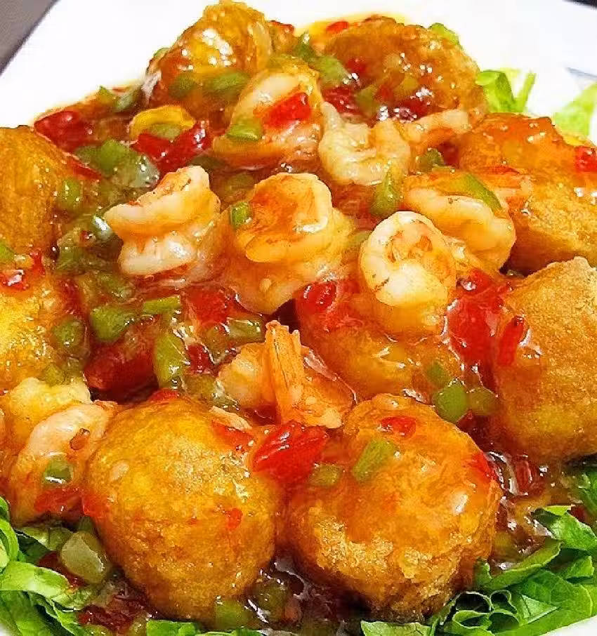 材料:日本豆腐2支,青椒半個,生菜1棵,泰式雞醬(泰式甜辣醬),蝦仁適量,料酒,白鬍椒粉,鹽,糖,澱粉;
