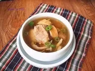 做法: 1.排骨洗凈,放入冷水鍋中焯燙去除血沫,撈出後,放入另一鍋清水中,放入生薑一塊、蔥一棵和八角一顆,大火燒開,小火燉煮2個小時,製成排骨湯。