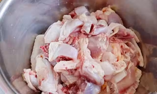 3.浸泡好的雞塊控干水分備用,然後將其放在炒鍋中。加入足量的清水沒過雞肉。清水的量一定要一次性加夠。然後將其大火燒開,這時候就不需要蓋蓋子了。