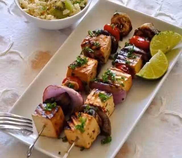 2、用烤簽將豆腐、蘑菇、彩椒串起來,並塗上一層醬汁。