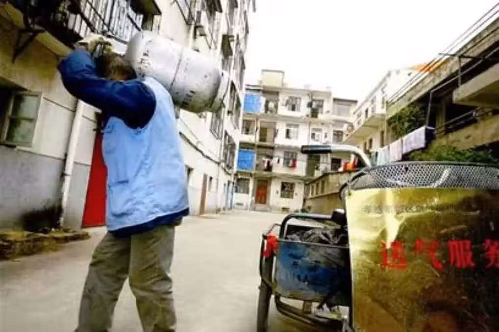 安裝好煤氣後,他還要扛著空的煤氣罐下樓。