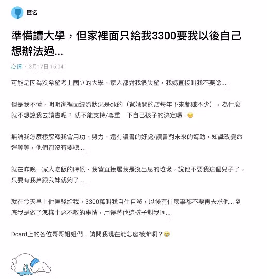 沒上國立大學!被爸媽趕出家門,稱「不要這個兒子了」他崩潰喊「只給我3300萬,要我自生自滅」