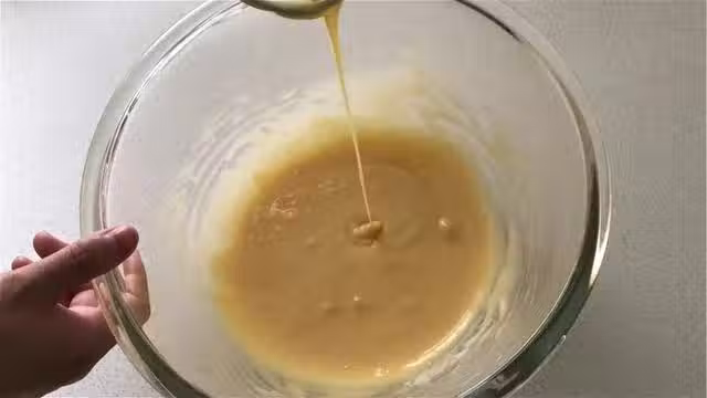 3.平底鍋不刷油,舀一勺麵糊,讓其自然流下成圓形,開最小火煎。