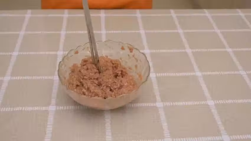 6、加入澱粉,繼續按同一方向攪拌,直到澱粉和肉餡融合均勻