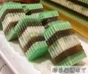 3. 將全部材料(C),除珍多,煮滾,將全部倒在(2)上面,再把珍多平均的鋪下,待半凝固。