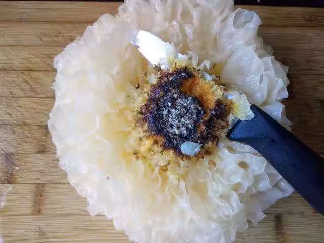 3.我用的是新鮮銀耳,不用泡發,洗凈後切去黑色部分。