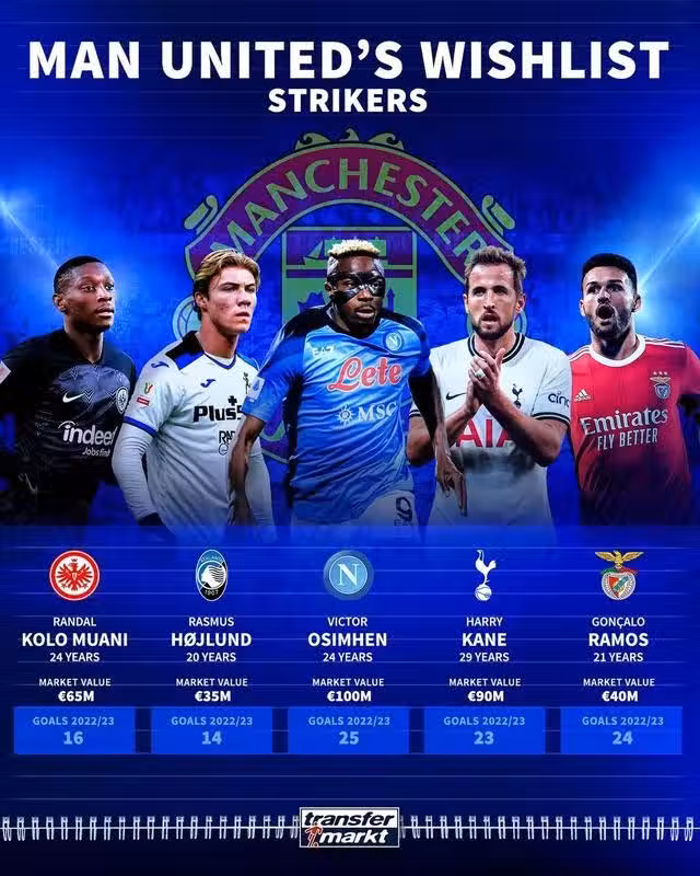 鋒線上,拉什福德和加納喬是非賣品,維霍斯特、馬夏爾、格林伍德等都有離隊的可能。熱刺射手哈里-凱恩是曼聯的最大目標,但簽下這位英格蘭隊長的難度較大。而那不勒斯的奧斯梅恩、本菲卡的貢薩洛-拉莫斯和法蘭克福的穆阿尼也在考察範圍內,這些球員都需要8000萬歐以上的費用,鋒線毫無疑問會是開支最大的地方。