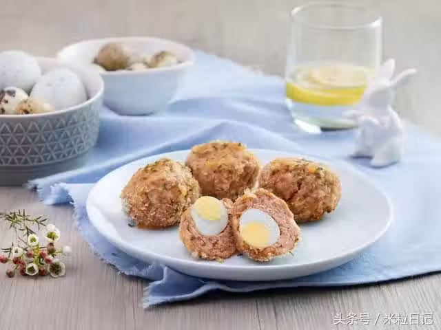 原料:豬肉餡200克、雞蛋6個、白洋蔥1/4個、全蛋液、麵粉、麵包糠1杯,1杯油、1大勺生抽、1大勺老抽、1大勺米酒、1大勺白鬍椒粉、鹽、雞蛋液1大勺、澱粉1小勺、香油1小勺。
