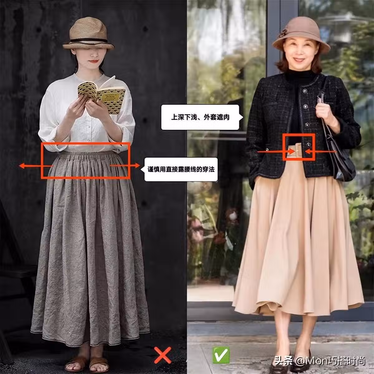 老了後,一條版型寬鬆、能遮住發福身材的裙子是「剛需」。褶皺裙的A字長款版型正好能滿足遮肉需求,變化多端的褶皺還比別的寬鬆裙更時髦減齡!