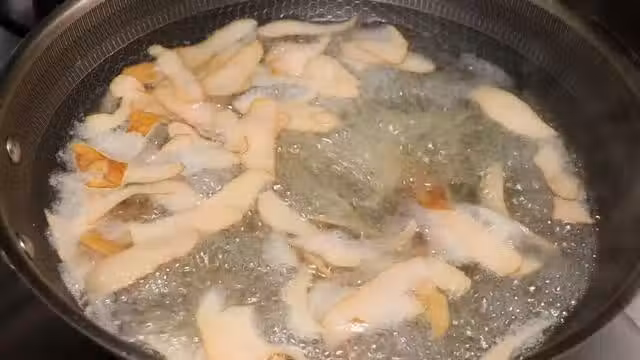 3.鍋內倒入適量的清水,下入梨皮,大火煮開後轉小火,煮五分鐘,將梨皮的香味煮出。